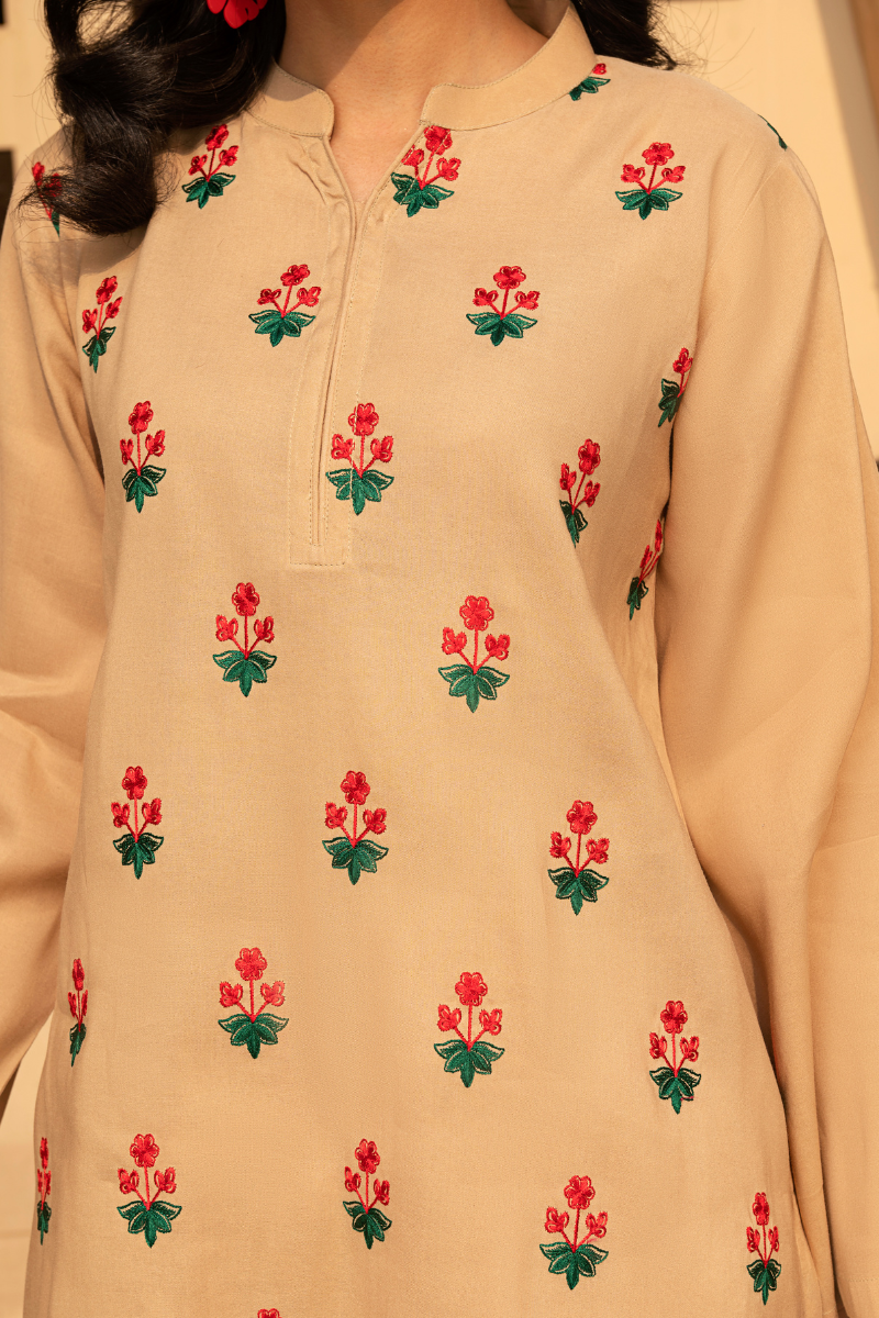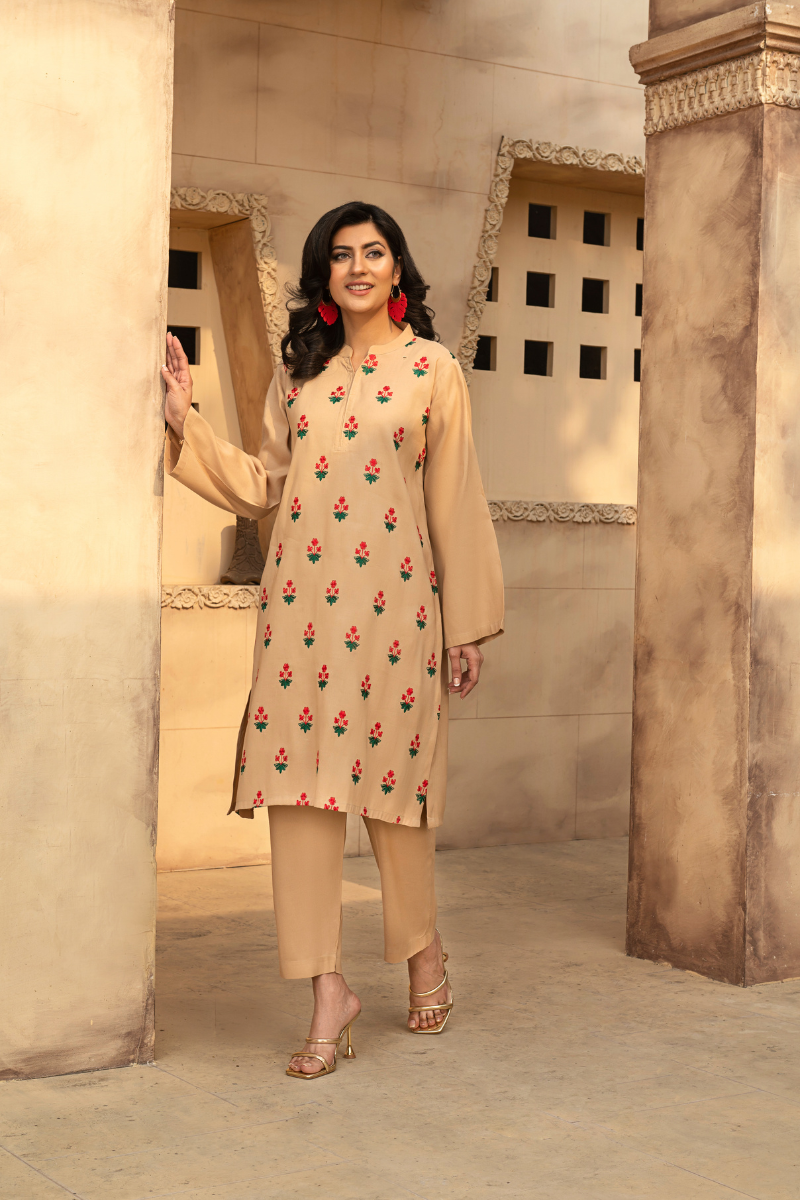 2 piece, ready to wear. Embroidery on front with a straight-cut kurta and matching trousers. Elegant and versatile for casual and semi-formal wear.