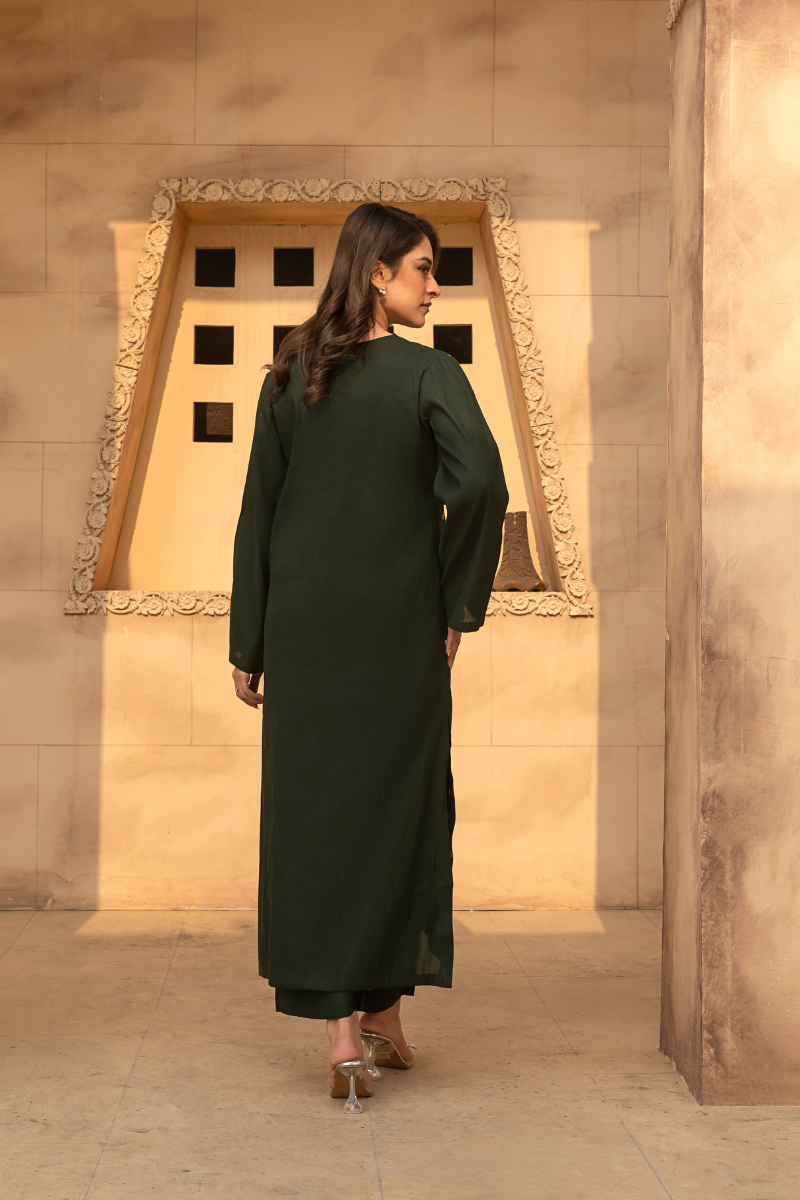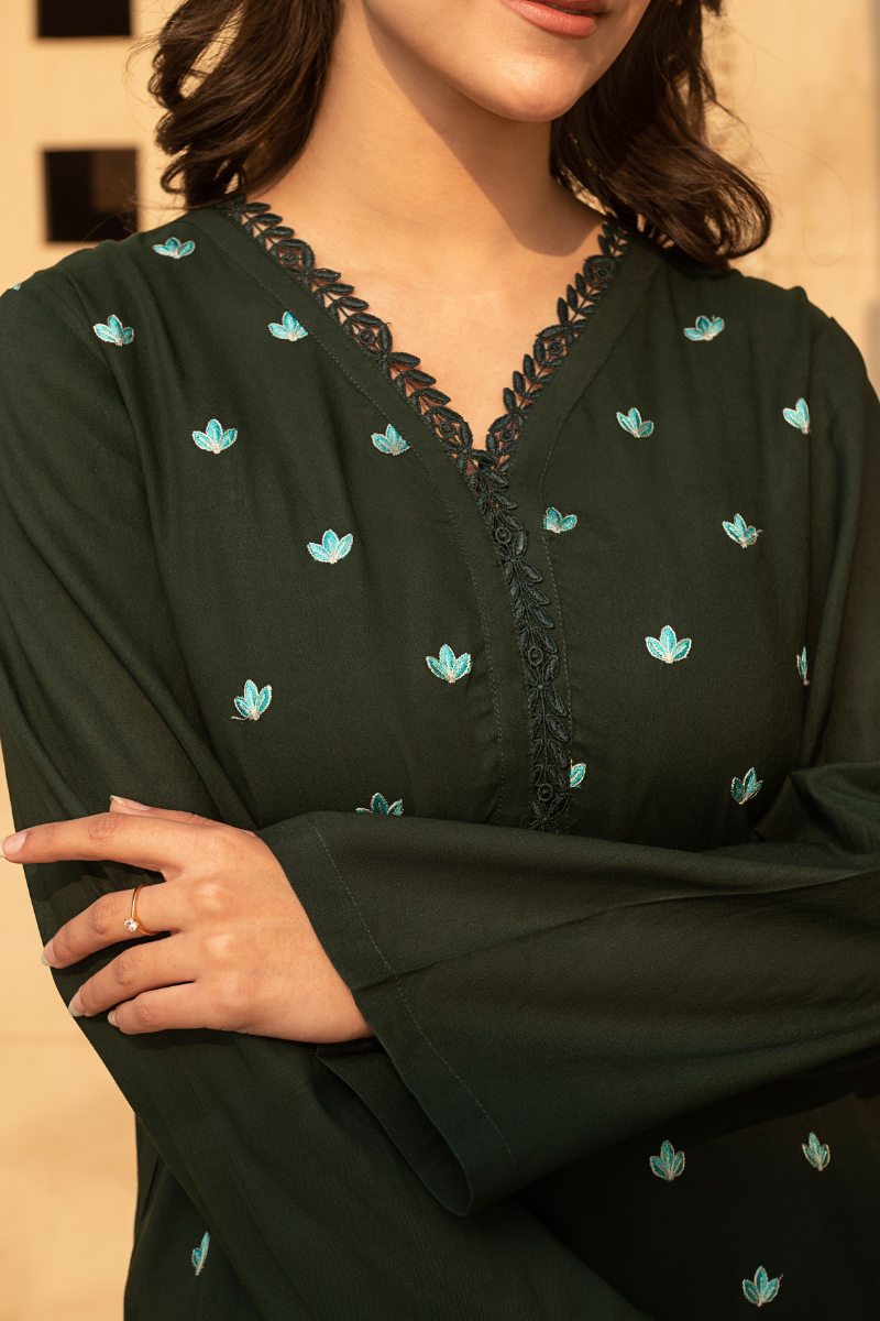 2 piece, ready to wear. Delicate embroidery motifs on front and a subtle lace-detailed neckline, paired with matching trousers. A refined choice for timeless style.